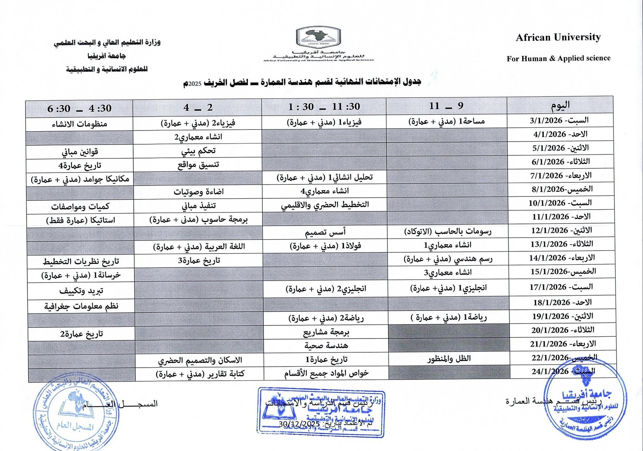 لتحميل جدول الامتحانات النهائية للفصل خريف 2025- 2026 قسم الهندسة المعمارية اضغط هنا