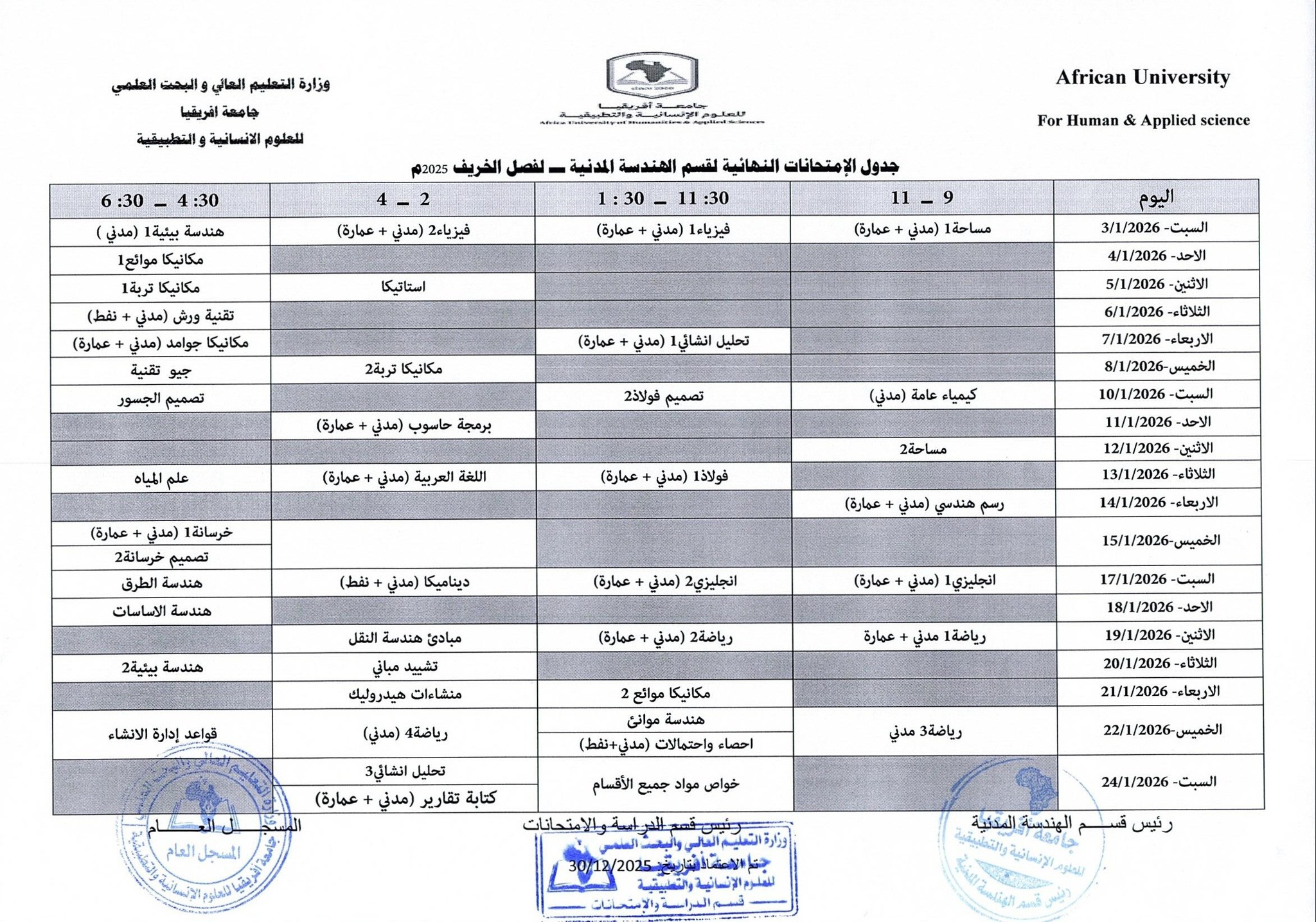 لتحميل جدول الامتحانات النهائية للفصل خريف 2025- 2026 قسم الهندسة المدنية اضغط هنا